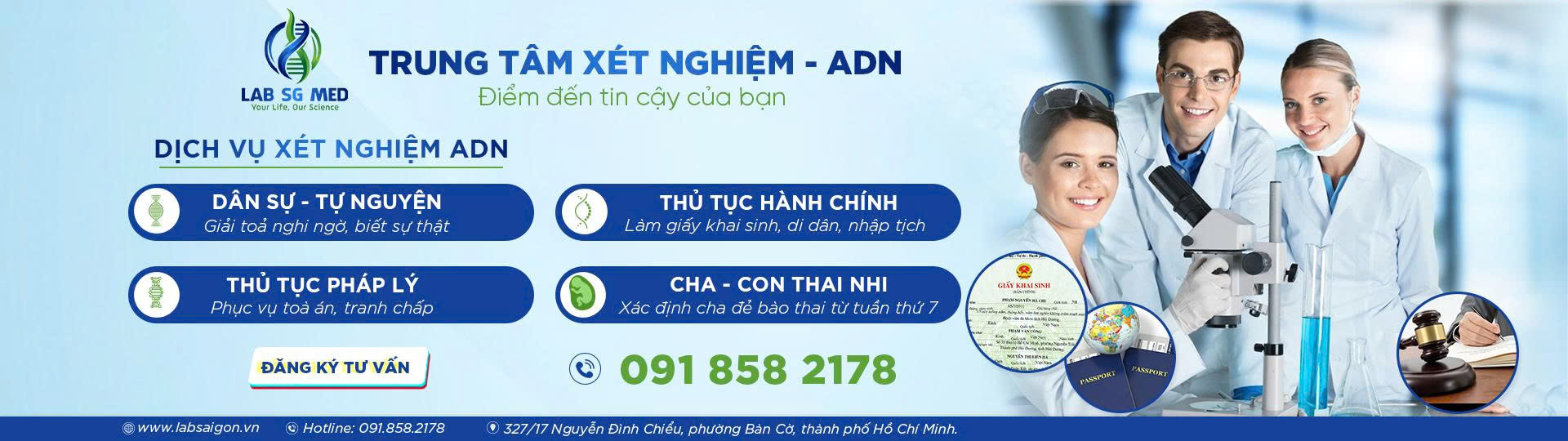 Trung tâm xét nghiệm LAB SG MED. Chúng tôi cung cấp các xét nghiệm ADN quan hệ huyết thống cho cá nhân giải tỏa nghi ngờ, làm khai sinh, di dân, nhập tịch, pháp lý, tòa án, giám định hài cốt. Các xét nghiệm được thực hiện theo quy trình kép, từ 24 đến 44 loci.