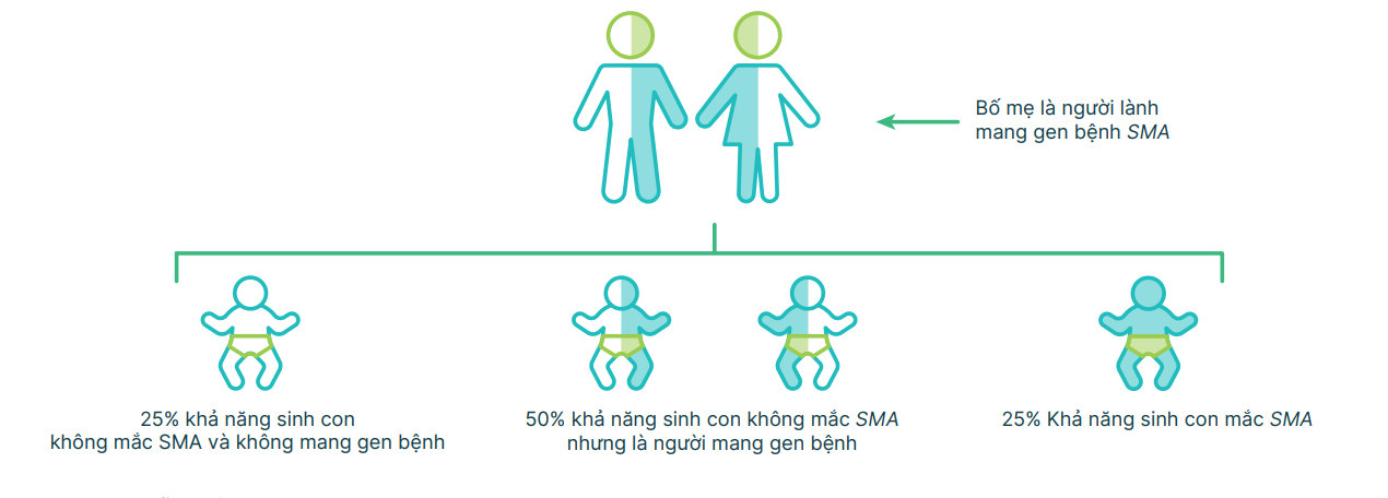 Những người mang dị hợp tử một biến thể SMN1 được gọi là người lành mang gen, không biểu hiện triệu chứng bệnh. Tuy nhiên, một người lành mang gen bệnh có nguy cơ sinh con mắc bệnh SMA nếu vợ hoặc chồng cũng là người lành mang gen bệnh. Khi đó, tỷ lệ sinh con trong mỗi lần mang thai:
