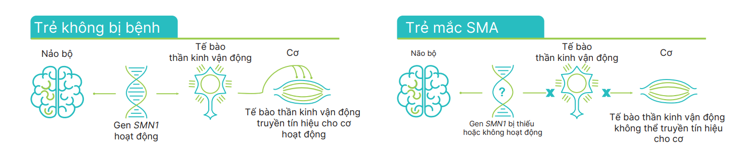 Bệnh SMA liên quan đến các biến thể gây bệnh trên gen SMN1 – gen nằm trên nhiễm sắc thể số 5, bệnh theo quy luật di truyền lặn trên nhiễm sắc thể thường (khoảng 95% do đồng hợp tử mất đoạn exon 7 hoặc exon 7- 8 trên gen SMN1, 5% do biến thể đơn nucleotide trên gen SMN1), khiến gen này không sản xuất đủ lượng protein SMN cần thiết cho sự dẫn truyền thần kinh cơ, dẫn đến các biểu hiện yếu, liệt vận động và teo cơ.