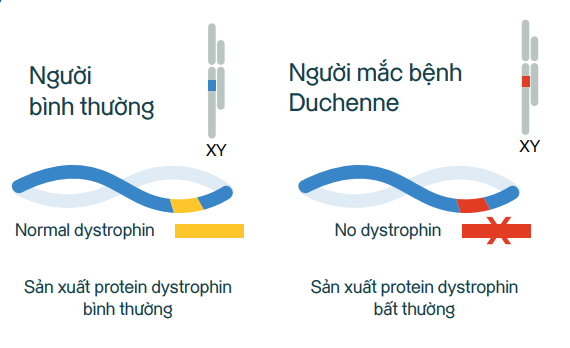 Bệnh loạn dưỡng cơ Duchenne do đột biến gen DMD. Gen DMD mã hóa sản xuất protein dystrophin có vai trò ổn định và bảo vệ sợi cơ. Đột biến gen DMD làm thay đổi cấu trúc, chức năng hoặc không sản xuất được protein dystrophin dẫn tới các tế bào cơ sẽ bị tổn thương, sợi cơ yếu đi và chết theo thời gian dẫn tới yếu cơ tiến triển.